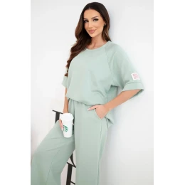 Dámský komplet z viskózy mikina a široké kalhoty máslový tmavě mentolový