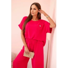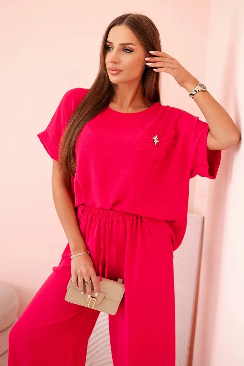 Dámský komplet z viskózy s ozdobným květem a širokými kalhotami - fuchsie