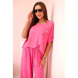Dámský komplet z viskózy s ozdobným květem a širokými kalhotami - růžový