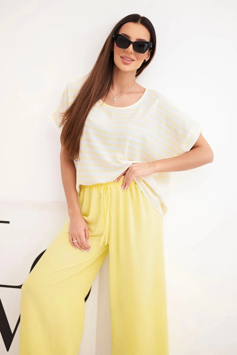 Dámský komplet z viskózy s pruhovanou blůzou a širokými kalhotami na gumu žlutý