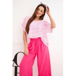 Dámský komplet z viskózy s pruhovanou blůzou a širokými kalhotami s gumou fuchsie