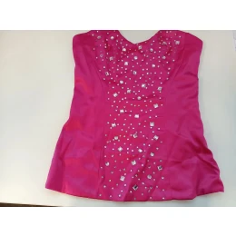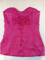 Dámský saténový korzet bez rukávů, podšitý. Přední díl pošitý kamínky Swarowski. Zavazování na zádech. Na boku zapínání na zip. Všité boční kostice.