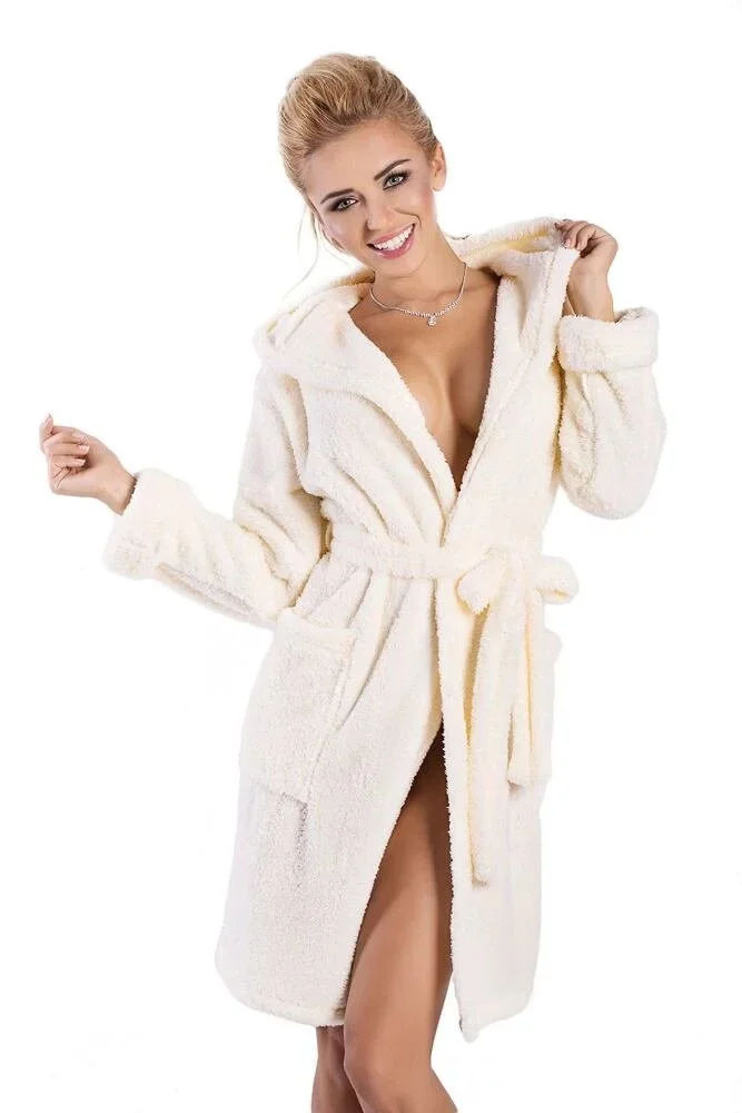 Měkoučký huňatý dámský župan ve smetanově bílé barvě.