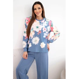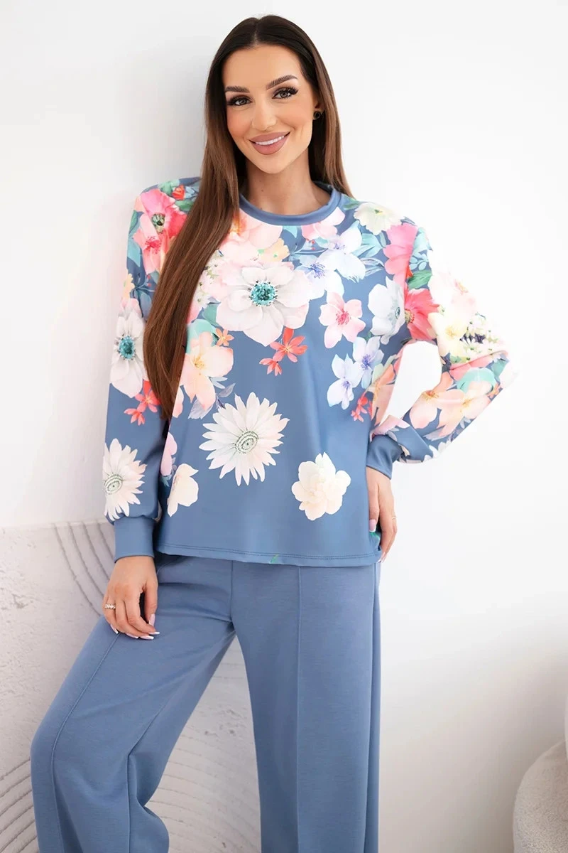 Dámský máslový viskózový komplet s květinovým vzorem a širokými nohavicemi jeansový