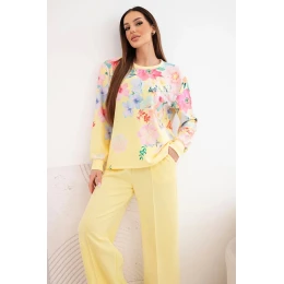 Dámský máslový viskózový komplet s květinovým vzorem se širokými nohavicemi žlutý