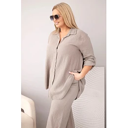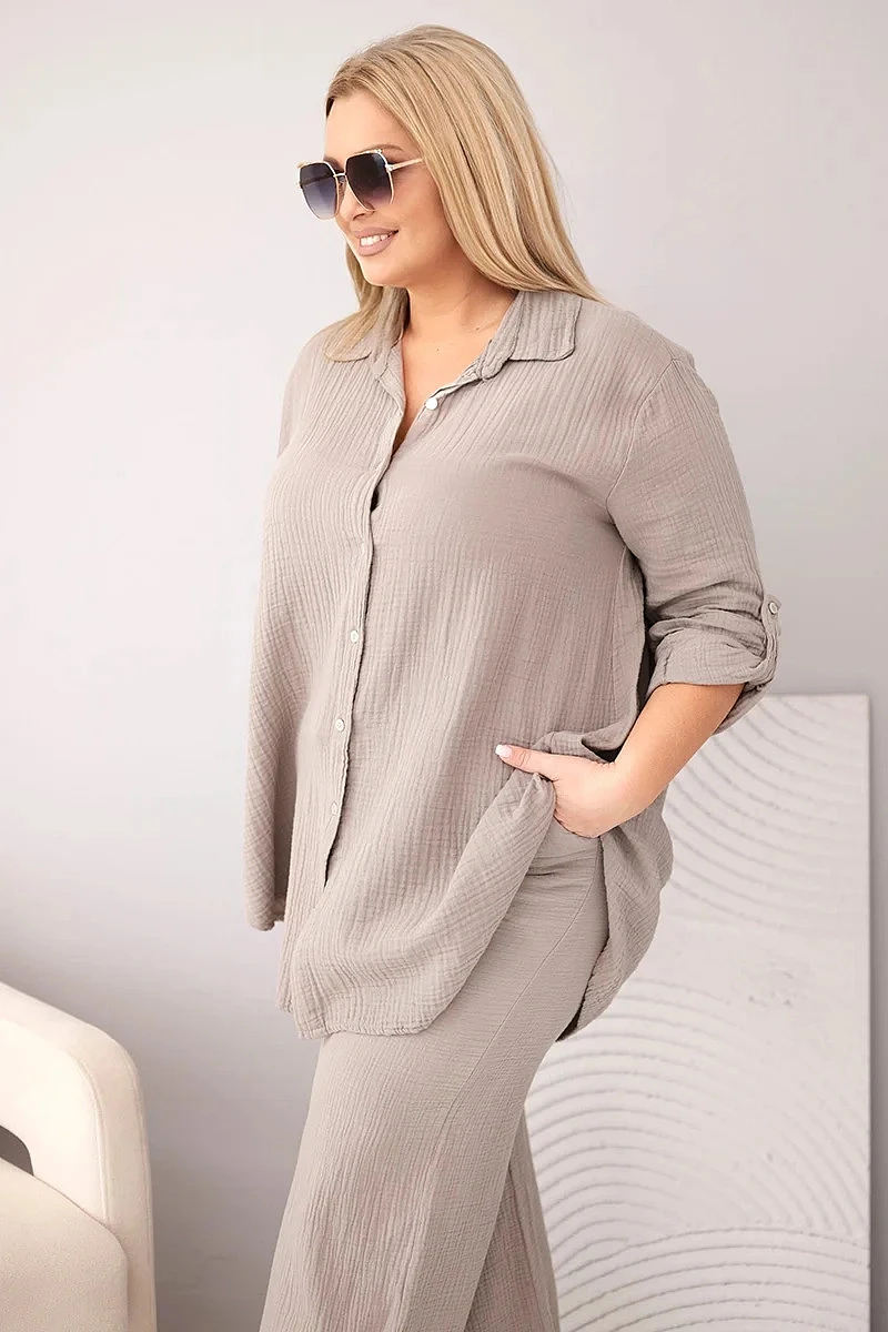 Dámský mušelínový komplet Plus Size s košilí zapínanou na knoflíky a kalhotami se širokými nohavicemi fango