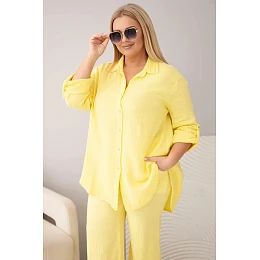 Dámský mušelínový komplet Plus Size s košilí zapínanou na knoflíky a kalhotami se širokými nohavicemi žlutý