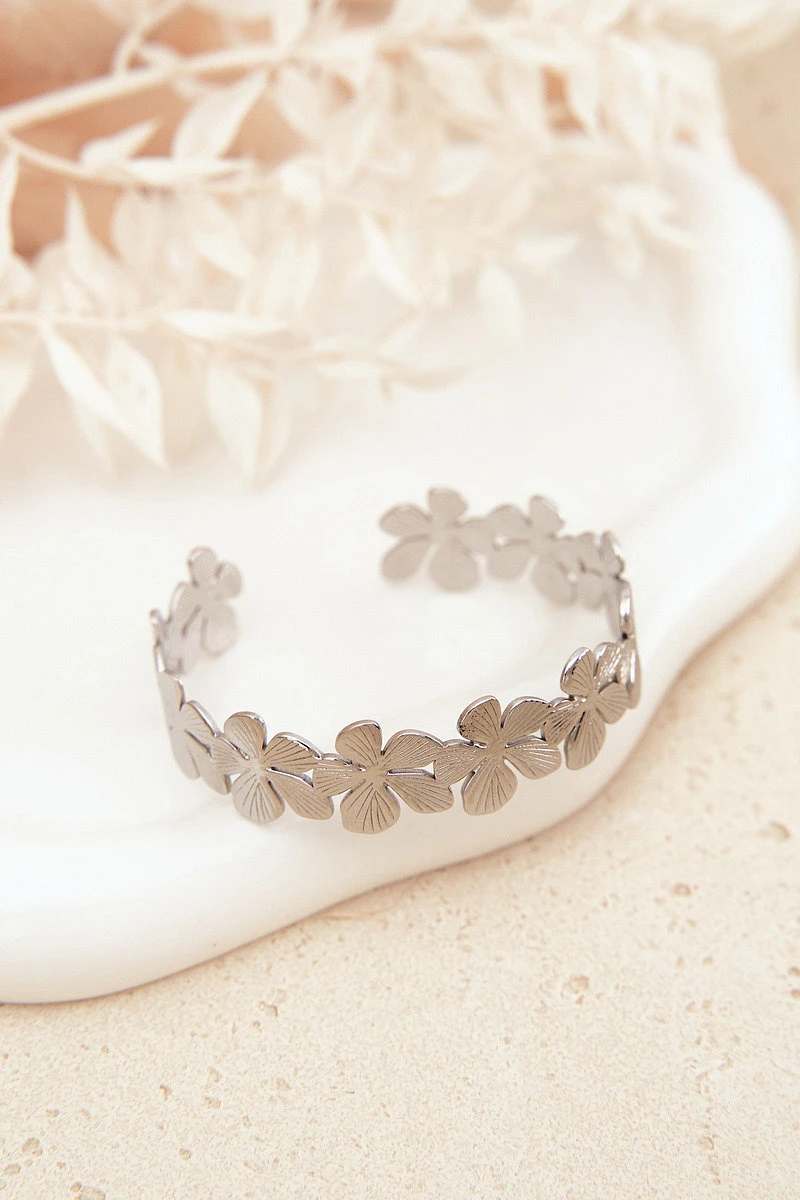 Dámský náramek vyrobený z nerezové oceli je skvělým doplňkem ke každému stylu. Model sestává z propojených květin, které dodávají šperku jemný, ženský charakter. Náramek nemá zapínání, což z něj činí pohodlné na nasazení a dobře se přizpůsobí zápěstí. Skvěle se hodí jak k běžným outfitům, tak jako doplněk k elegantnějšímu vzhledu.