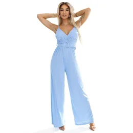 Dámský overal 593-2 Numoco basic - světle modrá barva - z měkkého pružného materiálu - psaníčkový výstřih smyslně zvýrazní výstřih - s tenkými ramínky - široké nohavice - látkový pásek s přezkou - ke každodennímu nošení i na formálnější příležitosti, tak i na na večírky