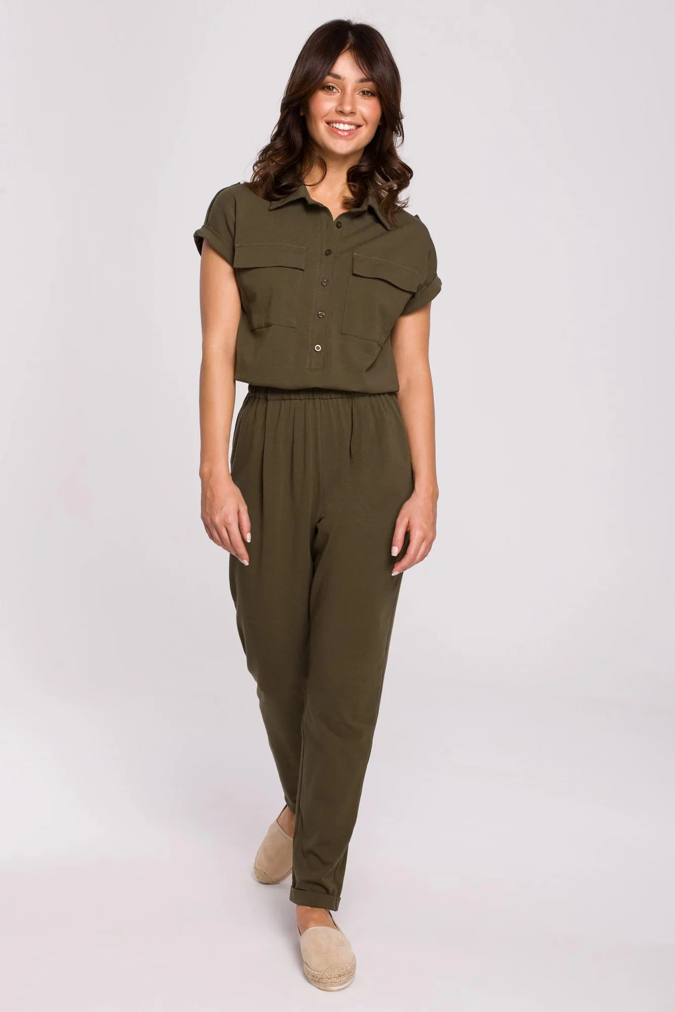 Praktické, uvolněné a dobře vypadající. Jedná se o naši kombinézu z měkkého žerzeje na bázi bavlny, která má vpředu kapsy s klopami ve stylu safari a límec. Vyberte si nejlepší barvu. Naše modelka měří 172 cm a nosí velikost S.