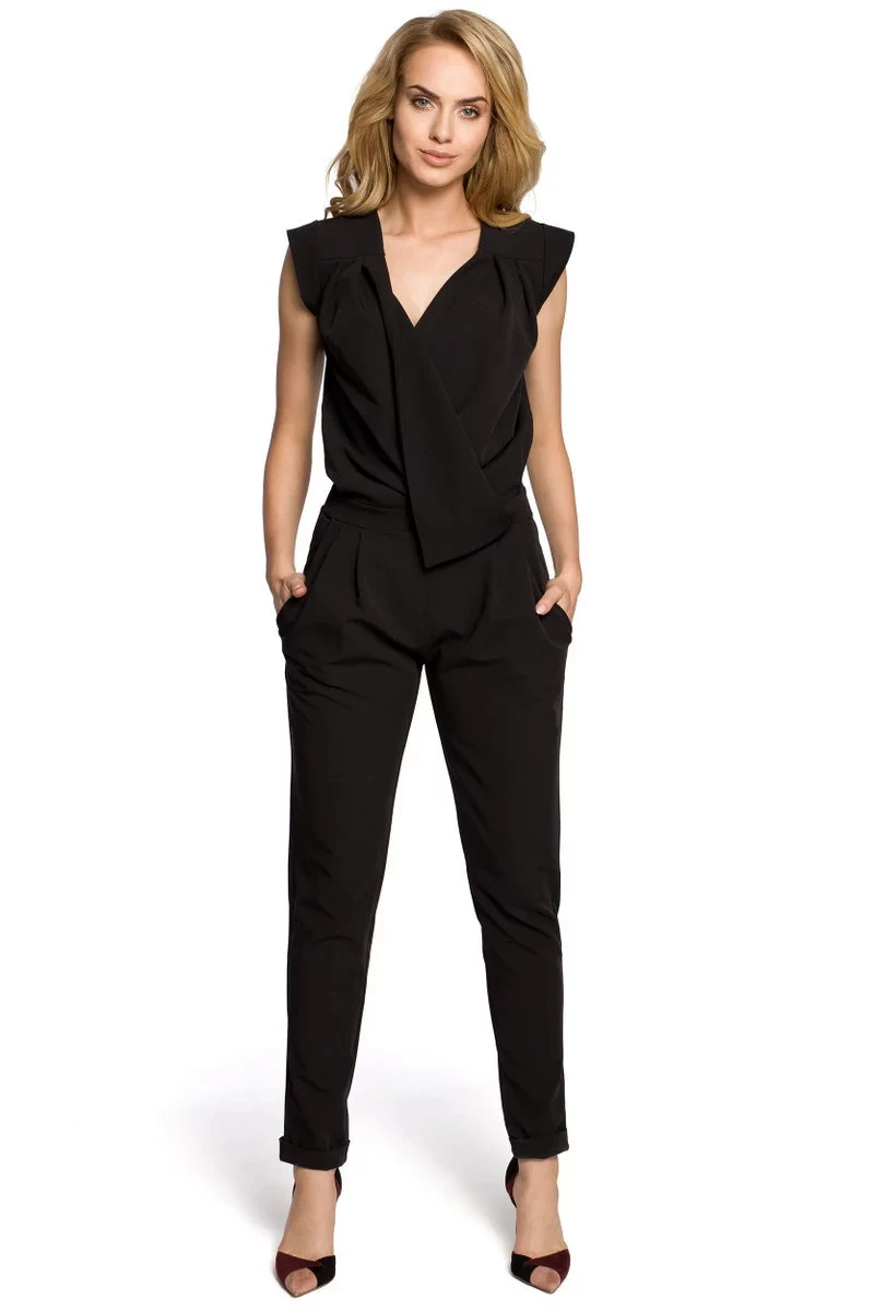 Zavinovací overal bez rukávů a s bočními kapsami. Úzké nohavice s ohrnutým lemem. Skrytý, boční zip.