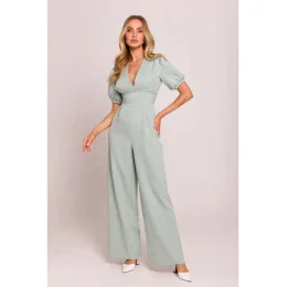INFORMACE O PRODUKTU: tkaná látka jednodílný overal hluboký výstřih ve tvaru písmene V a v pase nařasený krátký rukáv zakončený manžetami široké nohavice se záhyby v pase skrytý zadní zip částečně podšitý naše modelka je vysoká 171 cm a nosí velikost S navrženo a vyrobeno v Polsku
