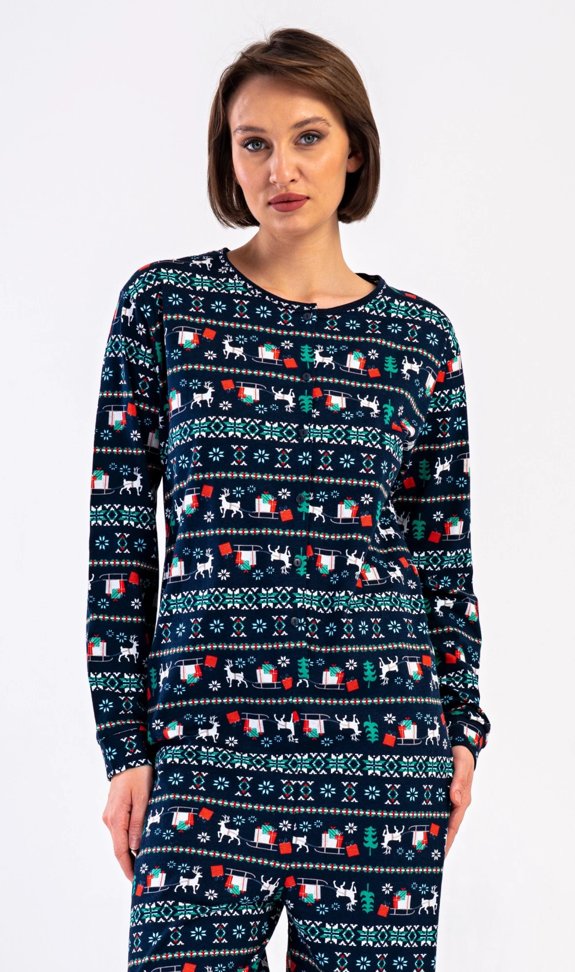 Dámský bavlněný overal Merry christmas. Overal je celopropínací, potištěný vánočními motivy. Dlouhé nohavice a rukávy jsou ukončeny lemy. Bavlněný materiál je poddajný a příjemný na dotek.