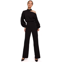Tento jedinečný overal je rafinovanou kreací pro velké příležitosti. Potěší dlouhými bufetovými rukávy s manžetami a extravagantním výstřihem s rozparkem přes jedno rameno. Oblek se zapíná na krytý zip a knoflíky.
