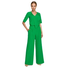 Kalhotový oblek pro zvláštní příležitosti s rukávy po lokty, obálkovým vrškem, záševky a kapsami. Široká nohavice. Zapínání na krytý zip.