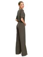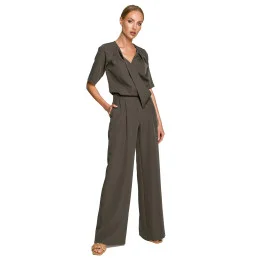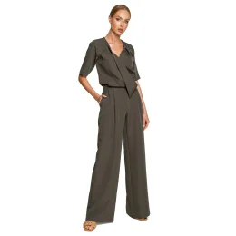 Kalhotový oblek pro zvláštní příležitosti s rukávy po lokty, obálkovým vrškem, záševky a kapsami. Široká nohavice. Zapínání na krytý zip.