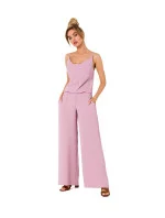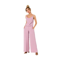 Kalhotový kostým s překládaným výstřihem a na tenkých ramínkách zavazovaných na zádech. Kombinéza s elastickým pasem a kapsami na bocích.