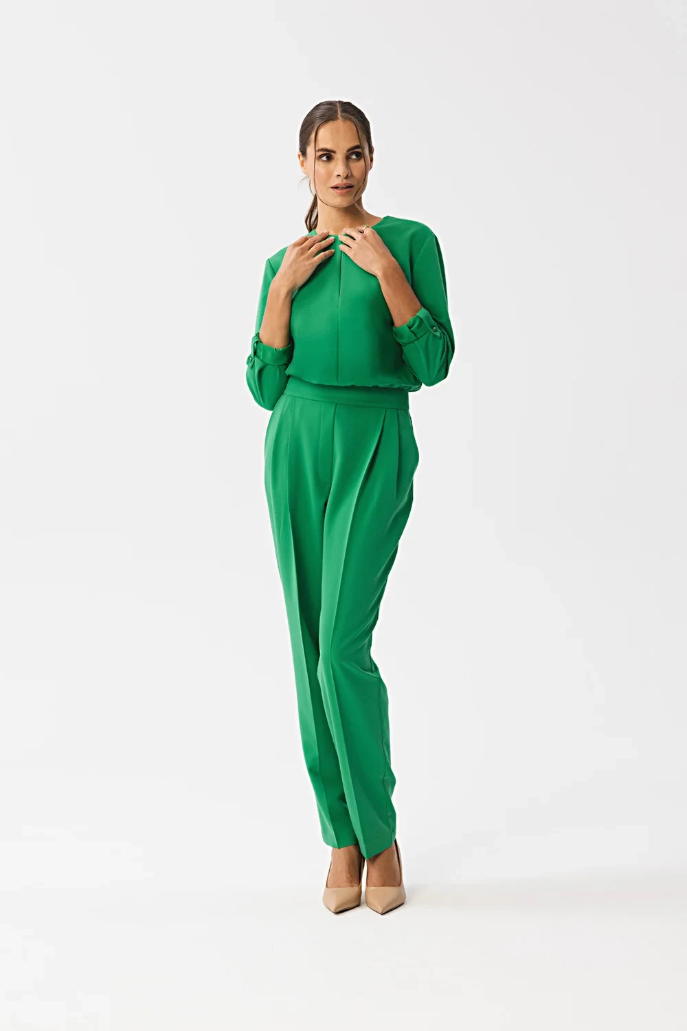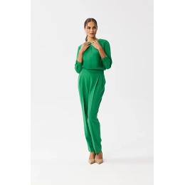 Představujeme jedinečný jednodílný overal, který kombinuje styl a pohodlí. Výstřih kombinézy zdobí nápadný rozparek, který jí dodává jemnost. Řasení v pase zvýrazňuje siluetu a dodává obleku eleganci. Na zádech je zapínání na knoflíky a krytý zip, který vede od pasu dolů. Dlouhé rukávy s manžetami a zapínáním, které umožňuje upravit délku, dodávají obleku jedinečný nádech. Nohavice jsou dlouhé a na spodním okraji stažené, což obleku dodává elegantní nádech. Boční kapsy jsou praktické i stylové. Kombinéza nemá podšívku, takže je lehká a pohodlná na nošení. Je ideální volbou pro mnoho příležitostí, od formálních setkání až po uvolněnější akce, a umožní vám vyniknout a cítit se výjimečně.
