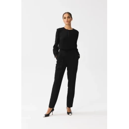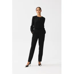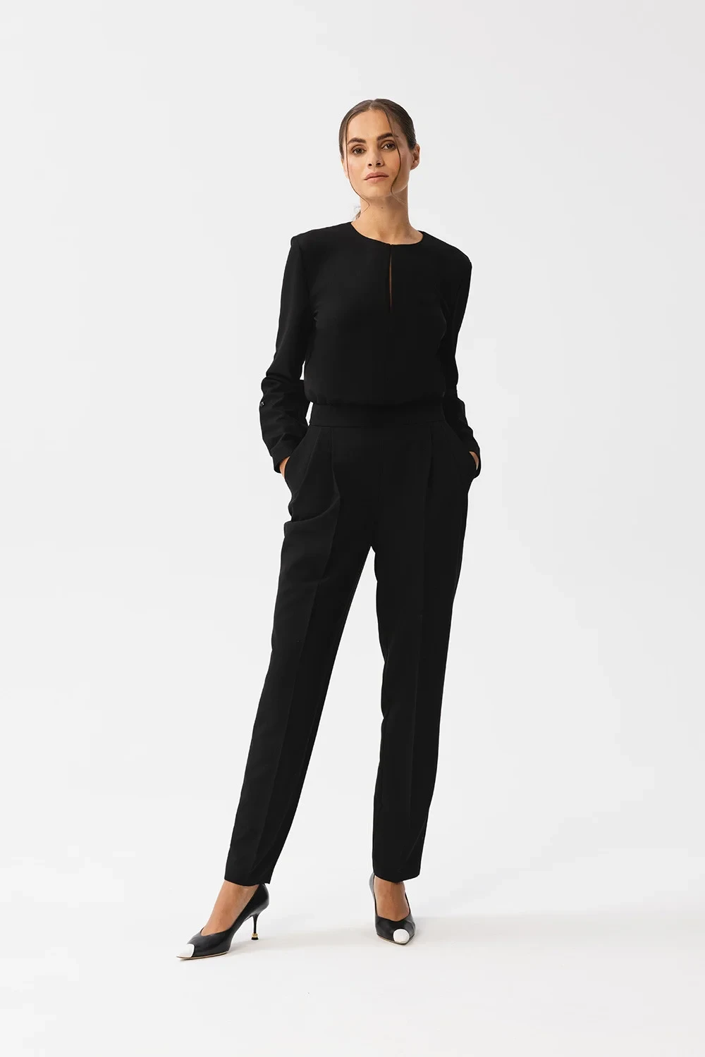 Představujeme jedinečný jednodílný overal, který kombinuje styl a pohodlí. Výstřih kombinézy zdobí nápadný rozparek, který jí dodává jemnost. Řasení v pase zvýrazňuje siluetu a dodává obleku eleganci. Na zádech je zapínání na knoflíky a krytý zip, který vede od pasu dolů. Dlouhé rukávy s manžetami a zapínáním, které umožňuje upravit délku, dodávají obleku jedinečný nádech. Nohavice jsou dlouhé a na spodním okraji stažené, což obleku dodává elegantní nádech. Boční kapsy jsou praktické i stylové. Kombinéza nemá podšívku, takže je lehká a pohodlná na nošení. Je ideální volbou pro mnoho příležitostí, od formálních setkání až po uvolněnější akce, a umožní vám vyniknout a cítit se výjimečně.