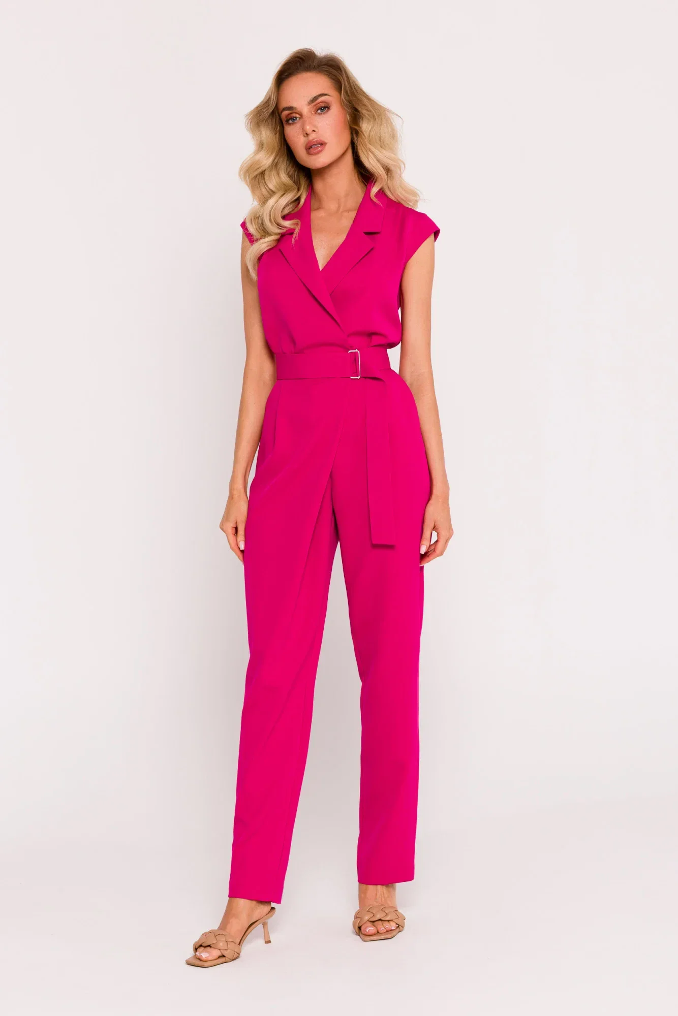 Představujeme jedinečný látkový overal, jehož design a zpracování odrážejí nejvyšší standardy polského krejčovství. Tento jednodílný oblek je kombinací modernosti, pohodlí a jedinečného stylu, který vyzařuje z polského krejčovského řemesla. Nohavice obleku, zužující se směrem dolů, upoutají pozornost ozdobnou asymetrií na boku, která celku dodává jemnou extravaganci. Vrchní část obleku tvoří obálková halenka bez rukávů s elegantním límcem a výstřihem do V. Jedná se o kombinaci klasiky a moderny, která vytváří nápadný a stylový vzhled. Pas v přední části kombinézy je opatřen miniaturním zapínáním na patentky a krytým zipem, díky čemuž je oděv nejen elegantní, ale také se snadno obléká a svléká. Zadní část pasu je elastická, což zajišťuje, že se kombinéza dokonale přizpůsobí postavě a zároveň zůstane pohodlná. Praktickým prvkem jsou boční kapsy, které dodávají obleku na užitečnosti. Součástí je navíc pásek se sponou, který zvýrazňuje pas a dodává stylizaci větší šmrnc. Tento oblek není pouhým oděvem, je výrazem polské preciznosti a kreativity v oblasti módy. Návrh a výroba v Polsku jsou zárukou vysoké kvality zpracování a důrazu na detail, díky čemuž je nošení tohoto obleku nejen pohodlné, ale i příjemné na pohled.