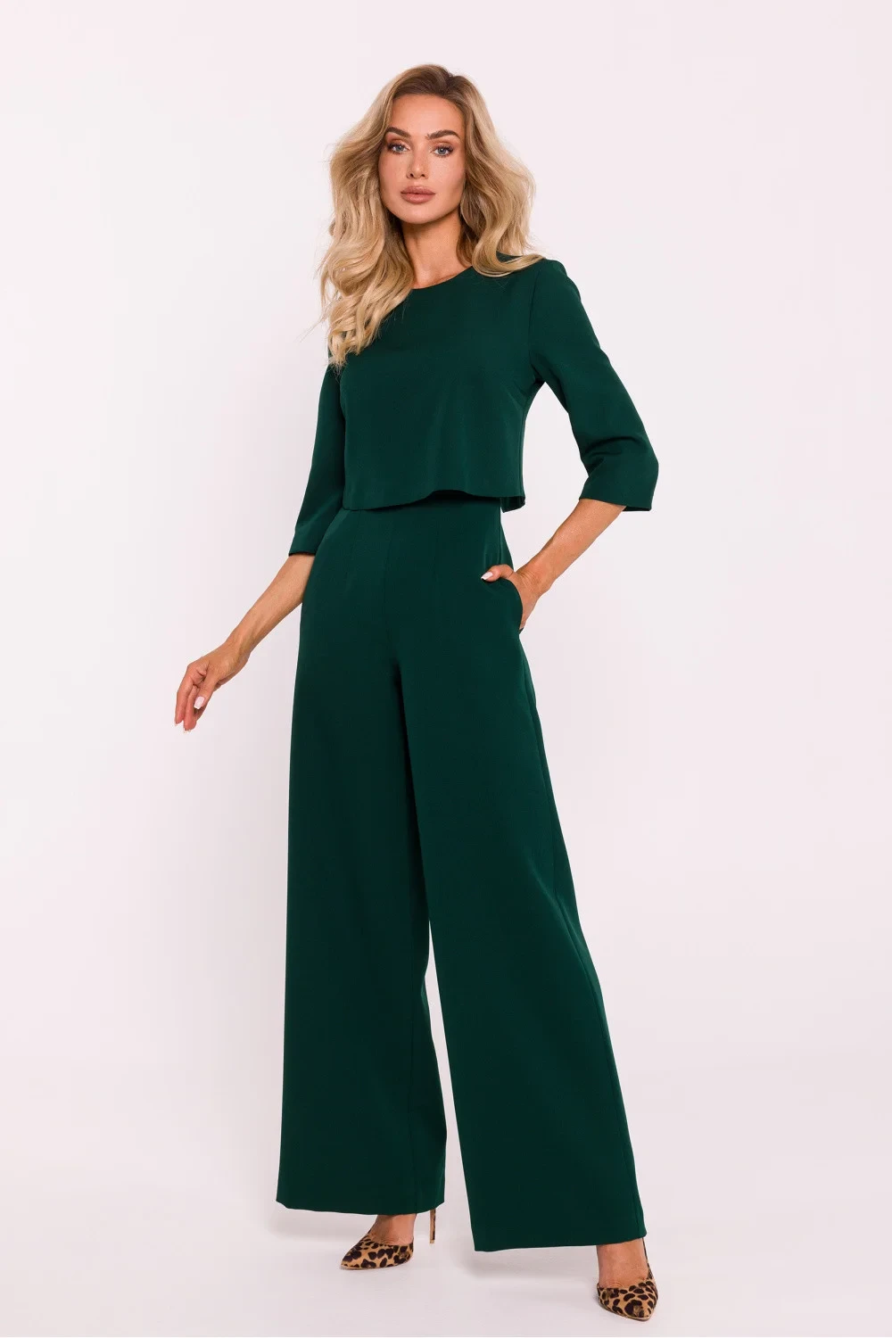 Elegantní dámský kombinéza vyrobený z vysokokvalitní látky. Vyznačuje se širokými nohavicemi, které mu dodávají módní, volný vzhled. Horní část kombinézy je dvojitá, co mu dodává strukturu a eleganci a krátké rukávy zajišťují pohodlí v teplejších dnech. Na zadní straně se nachází krytý zip, který usnadňuje oblékání a svlékání. Vložené boční kapsy přidávají praktičnost a funkčnost. Navrženo a ušito v Polsku, kombinuje moderní styl s vynikajícím řemeslem.