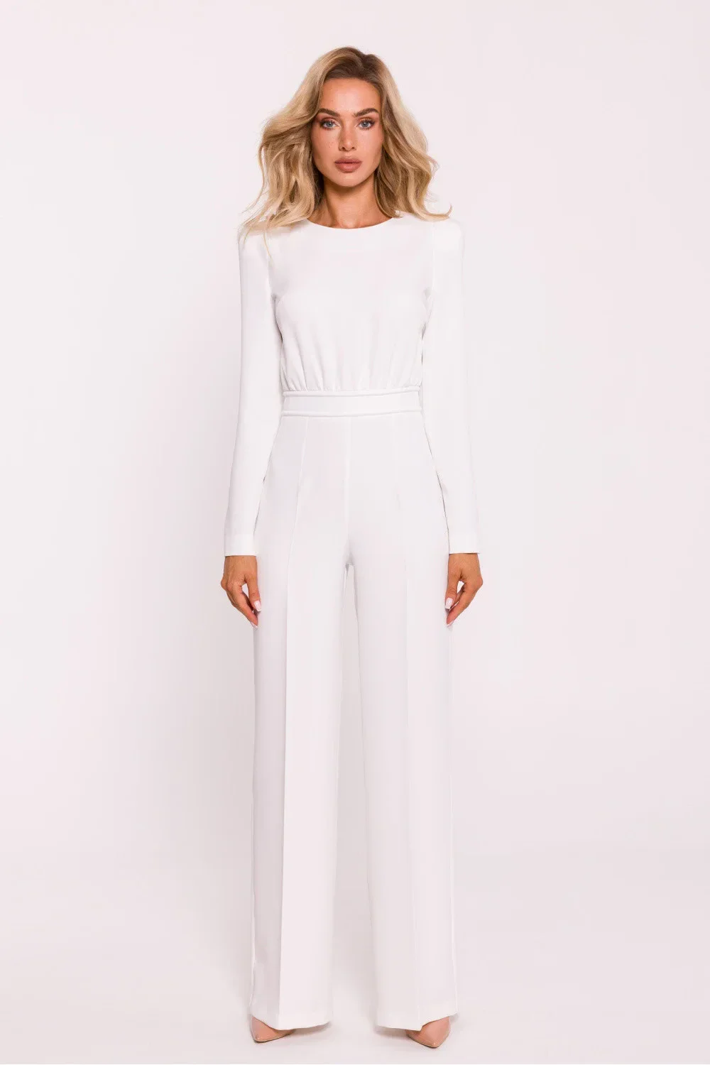 Tento elegantní dámský overal je vyroben z vysoce kvalitní tkaniny a kombinuje moderní styl s pohodlným nošením. Vrchní část kombinézy je vypasovaná, s dlouhými rukávy a ramena byla zvýrazněna vysokými vycpávkami, které dodávají siluetě svěží a elegantní vzhled. Na zádech je ozdobný kovový zip, který plní praktickou i dekorativní funkci. Nohavice jsou mírně rozšířené, což dodává celkovému vzhledu ležérní, elegantní nádech. Oblek byl navržen a ušit v Polsku, což zaručuje preciznost a vysokou kvalitu výrobku.