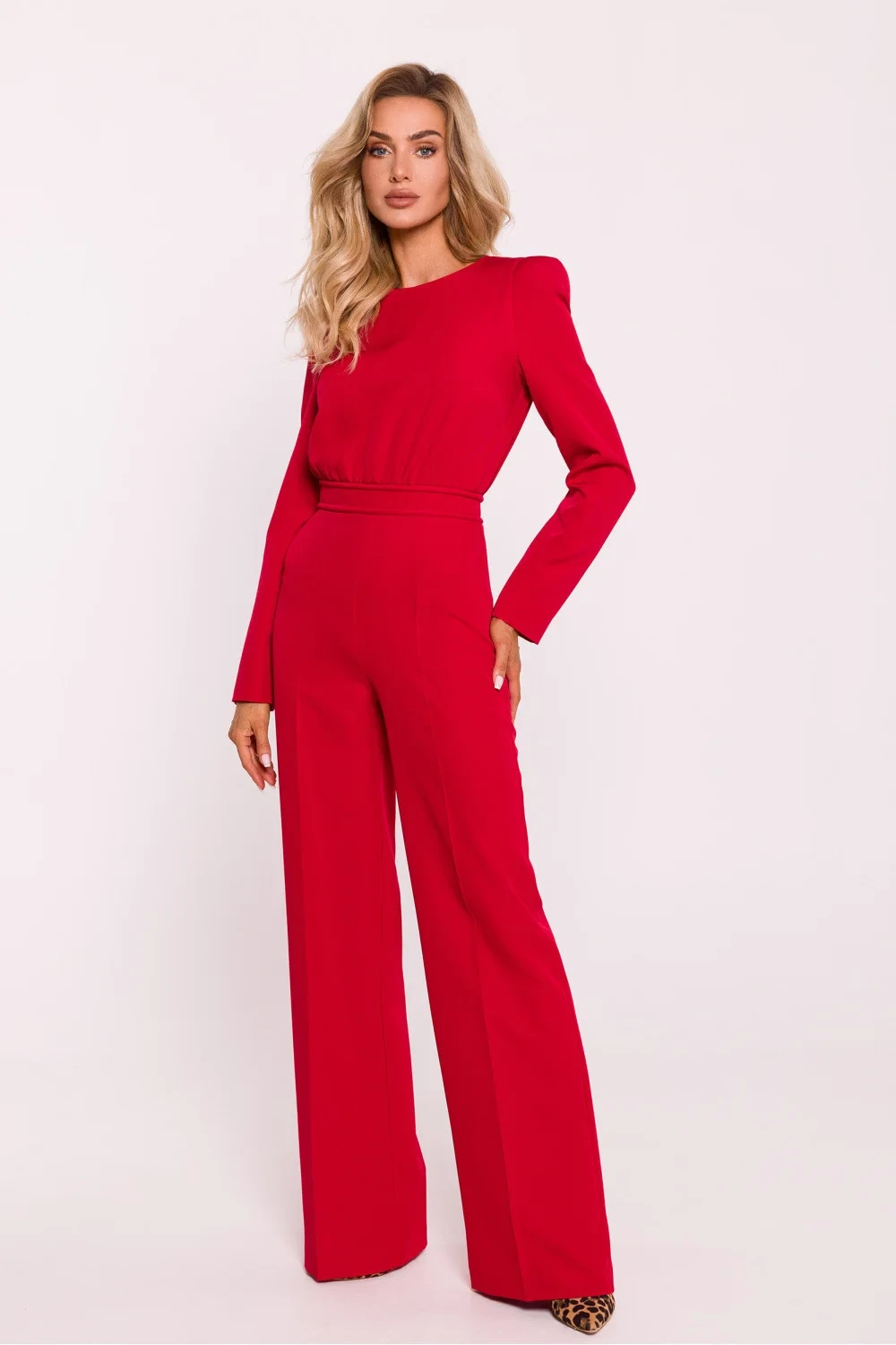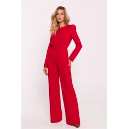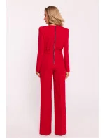 Tento elegantní dámský overal je vyroben z vysoce kvalitní tkaniny a kombinuje moderní styl s pohodlným nošením. Vrchní část kombinézy je vypasovaná, s dlouhými rukávy a ramena byla zvýrazněna vysokými vycpávkami, které dodávají siluetě svěží a elegantní vzhled. Na zádech je ozdobný kovový zip, který plní praktickou i dekorativní funkci. Nohavice jsou mírně rozšířené, což dodává celkovému vzhledu ležérní, elegantní nádech. Oblek byl navržen a ušit v Polsku, což zaručuje preciznost a vysokou kvalitu výrobku.