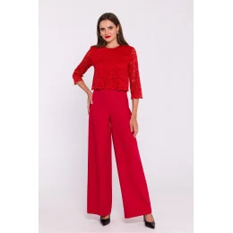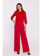 Tento elegantní overal z hladké tkaniny s krajkovým vrškem je jedinečnou kombinací klasiky a elegance. Horní díl z jemné krajky mu dodává romantický nádech, zatímco krátké krajkové rukávy mu dodávají lehkost a jemnou ženskost. Široké nohavice opticky prodlužují siluetu a zajišťují volnost pohybu, čímž vytvářejí efekt rafinované elegance. Skrytý zip na zádech zajišťuje pohodlné oblékání a dokonalé přizpůsobení. Oblek byl navržen a ušit v Polsku, což zaručuje vysokou kvalitu zpracování a smysl pro detail. Ideální pro zvláštní příležitosti, kdy chcete vyniknout originálním stylem.