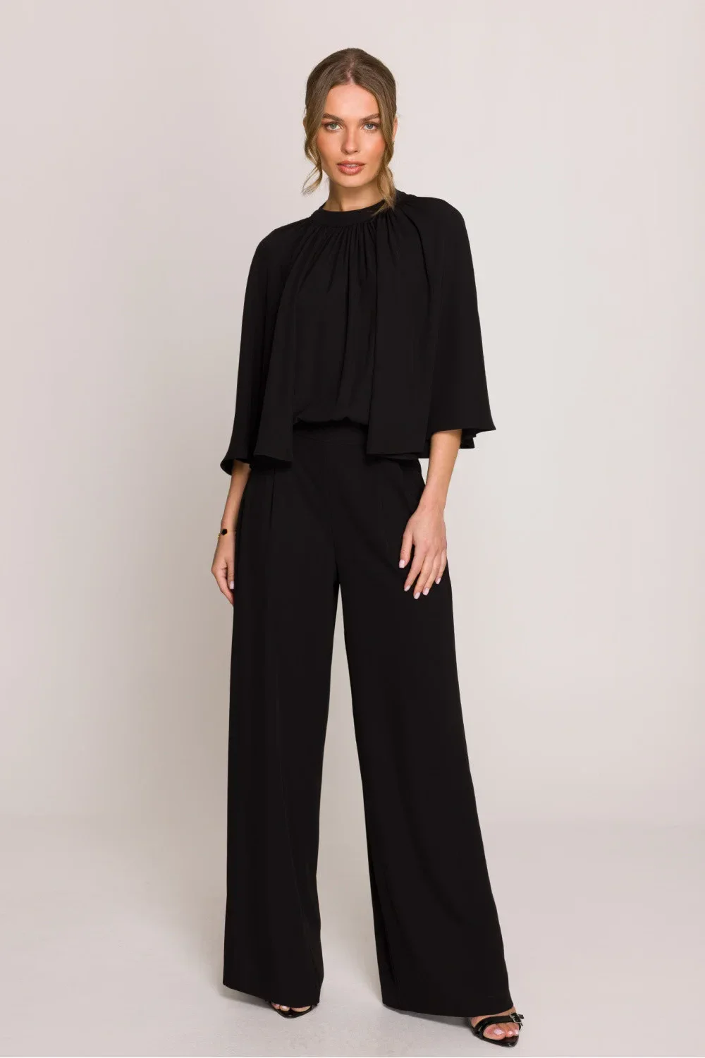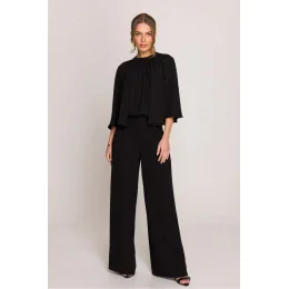 Elegantní a sofistikovaný overal, který spojuje styl a pohodlí v dokonalé harmonii. Vrchní část jemně začesaná, s širokými kimono rukávy, dodává lehkost a jemný objem. Výstřih se stojánkem, který se váže vzadu dlouhými šátky, umožňuje upravit přizpůsobení, a rozříznutí na zádech lze libovolně otevřít nebo zavřít, přizpůsobit podle vlastních preferencí. Široké, volně padající nohavice přidávají eleganci a volnost pohybu, a boční kapsy zajišťují funkčnost. Model se zapíná na skrytý zip vzadu, co zdůrazňuje jeho estetické provedení. Navržen a ušit v Polsku s nejvyšší péčí o detaily. Ideální na speciální příležitosti a stylové výstupy. Délka v tabulce se vztahuje k délce nohavice.