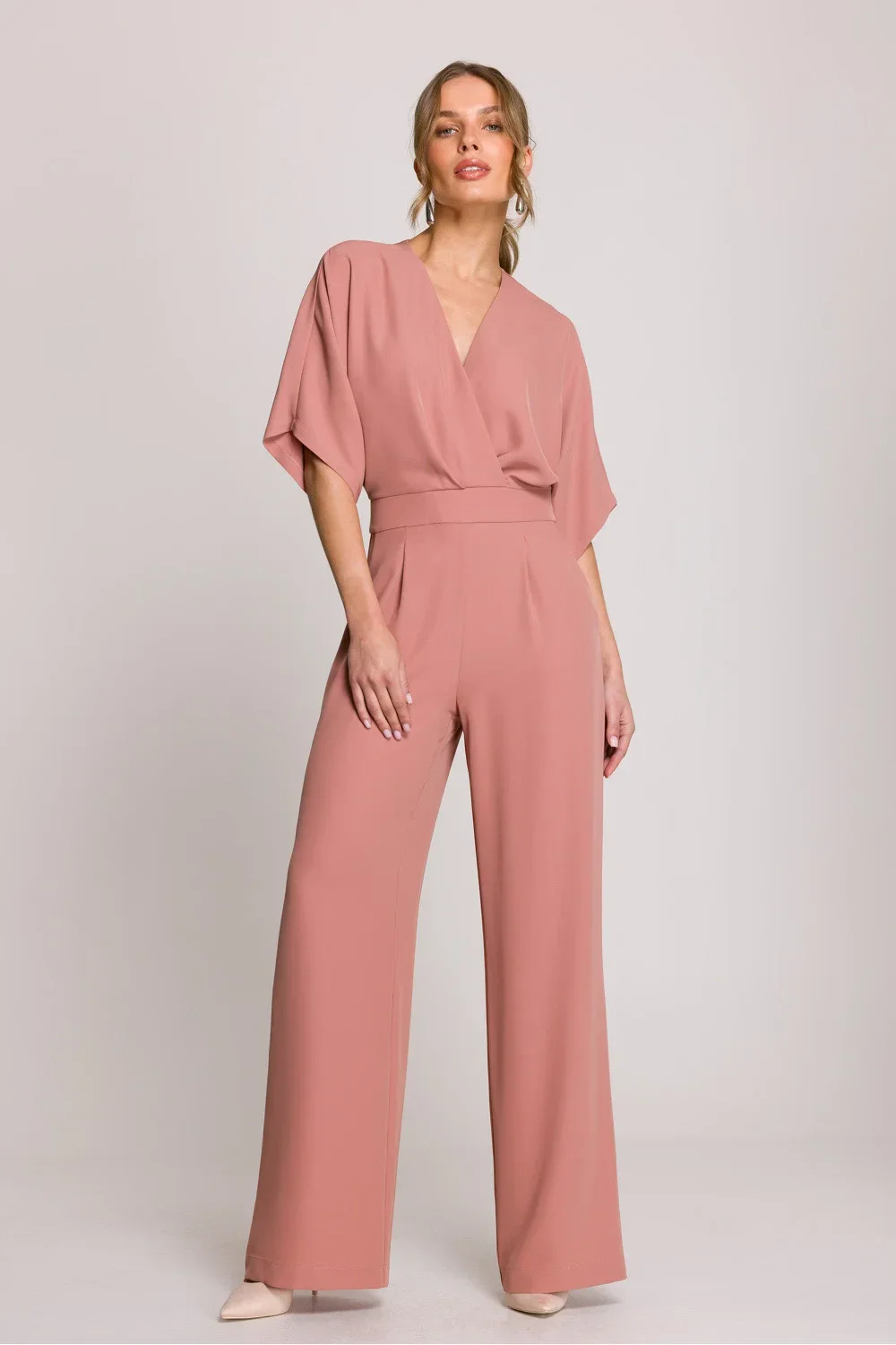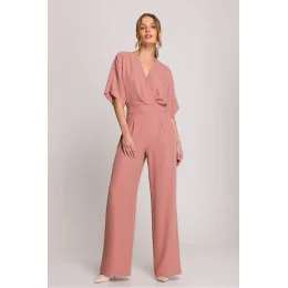 Elegantní a stylový dámský kombinéza, který spojuje pohodlí s ženským střihem. Horní část ve složeném stylu s jemnými záhyby krásně padne na postavě a V výstřih dodává lehkost a zdůrazňuje linii krku. Krátké rukávy zajišťují pohodlí a volnost pohybu. Mírně rozšířené nohavice dodávají celku harmonické proporce a boční kapsy přidávají praktický charakter. Model se zapíná na skrytý zip na zádech, díky čemuž vypadá esteticky a elegantně. Kombinéza navržena a ušita v Polsku s důrazem na detaily. Ideální volba na každý den, do práce nebo na speciální příležitosti.