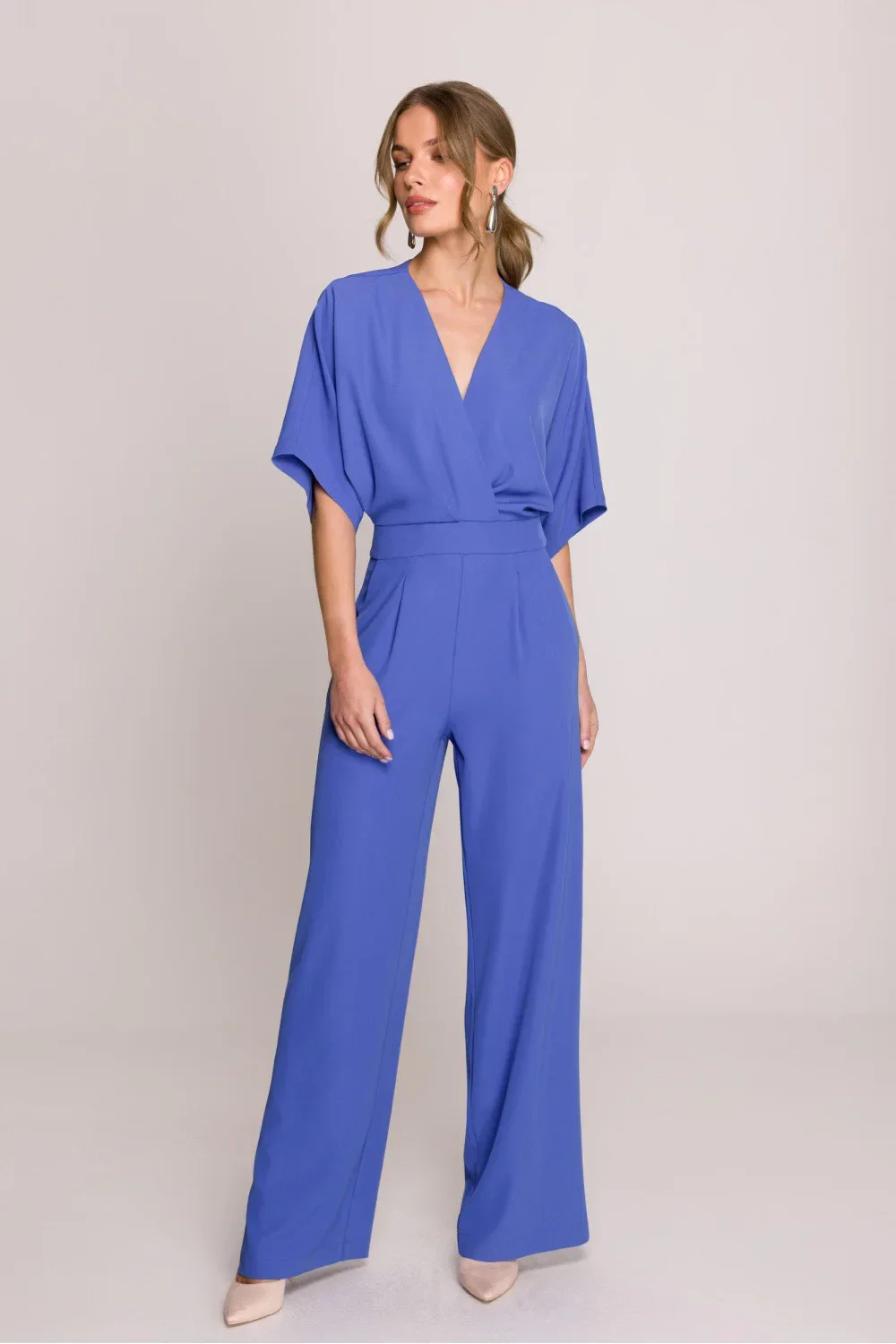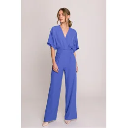 Elegantní a stylový dámský overal, který spojuje pohodlí s ženským střihem. Horní část ve stylu křížového límce s decentními záložkami krásně padne na postavě, a V výstřih dodává lehkost a zdůrazňuje linii krku. Krátké rukávy zajistí pohodlí a volnost pohybu. Lehce rozšířené nohavice dodávají celku harmonické proporce, a boční kapsy přidávají praktický charakter. Model zapínán na skrytý zip vzadu, díky čemuž vypadá esteticky a elegantně. Overal navržen a ušit v Polsku s důrazem na detaily. Ideální volba na každý den, do práce nebo na speciální příležitosti.