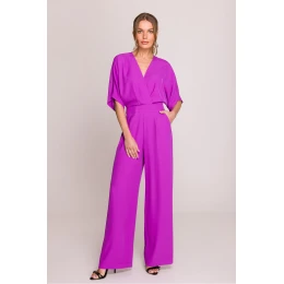 Elegantní a stylový dámský overal, který spojuje pohodlí s ženským střihem. Horní část s překrytým stylem a jemnými záhyby se krásně usazuje na postavě, a Výstřih dodává lehkost a zdůrazňuje linii krku. Krátké rukávy zajišťují pohodlí a volnost pohybu. Lehce rozšířené nohavice dodávají celku harmonické proporce a boční kapsy dodávají praktický charakter. Model se zapíná na skrytý zip vzadu, díky čemuž vypadá esteticky a elegantně. Overal je navržen a ušit v Polsku s důrazem na detaily. Ideální volba na každý den, do práce nebo na speciální příležitosti.