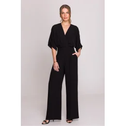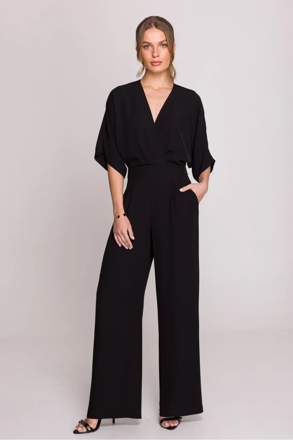 Elegantní a stylový dámský kombinéza, který spojuje pohodlí s ženským střihem. Horní část v klopovém stylu s jemnými záhyby krásně padne na postavě, a Výstřih dodává lehkost a zdůrazňuje linii krku. Krátké rukávy zajišťují pohodlí a volnost pohybu. Lehce rozšířené nohavice dodávají celku harmonické proporce, a boční kapsy přidávají praktický charakter. Model se zapíná na skrytý zip na zádech, díky čemuž vypadá esteticky a elegantně. Kombinéza navržena a ušita v Polsku s důrazem na detaily. Ideální volba na každý den, do práce nebo na výjimečné příležitosti.