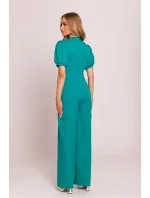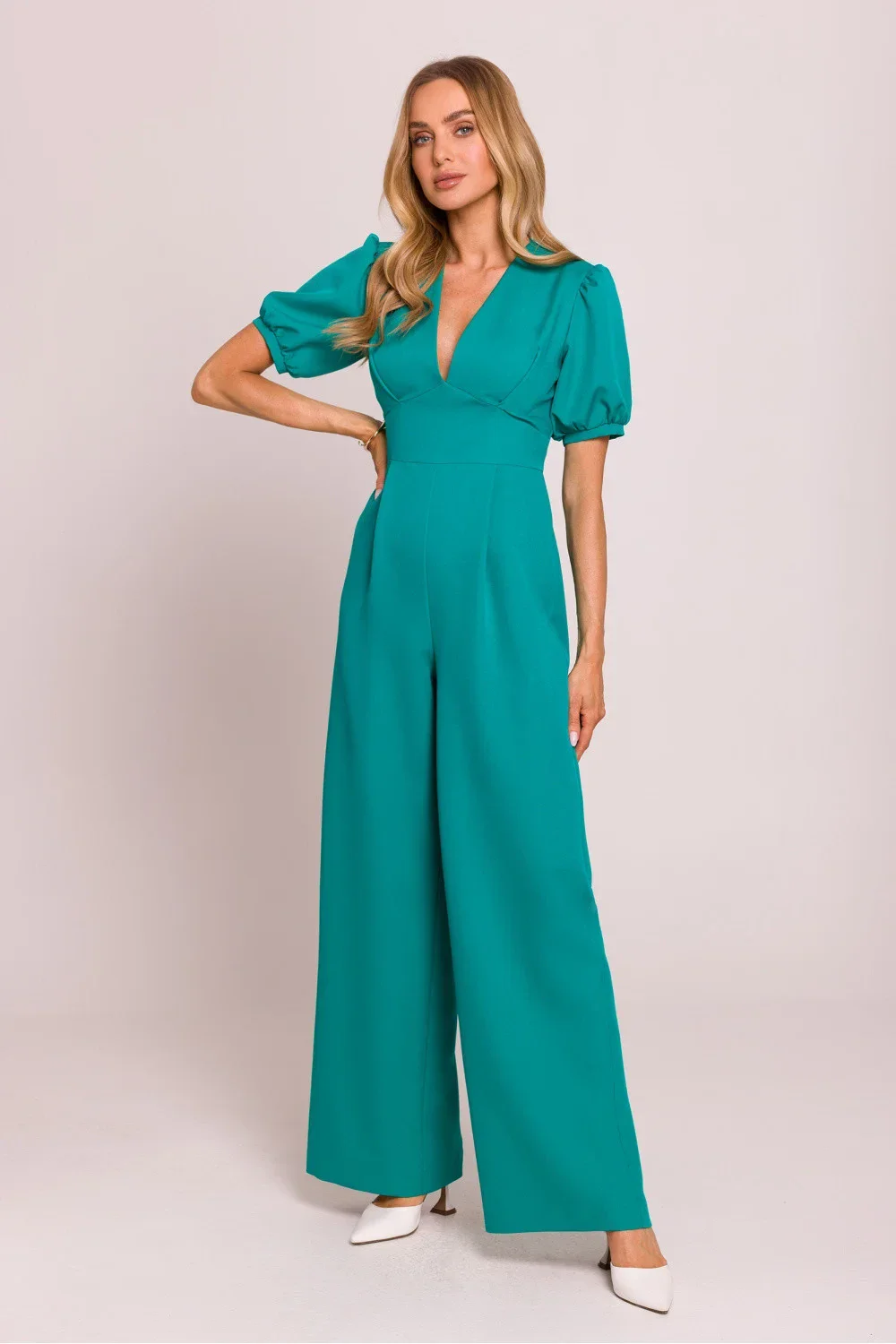 Elegantní kombinéza s ženským střihem, vyrobená z vysoké kvality látky. Hluboký výstřih ve tvaru písmene V krásně zdůrazňuje krk a dekolt, zatímco zdůrazněný pas podtrhuje postavu. Krátké nadýchané rukávy s manžetami přidávají romantický akcent, zatímco lehce rozšířené nohavice s přehybem od pasu zajistí elegantní a volný vzhled. Model se zapíná na skrytý zip na zadní straně, s vrchní částí na podšívce pro větší pohodlí nošení. Celý kousek je navržen a ušit v Polsku s péčí o každý detail.