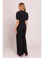 Elegantní kombinéza s ženským střihem, vyrobená z vysoce kvalitní látky. Hluboký výstřih ve tvaru písmene V krásně zdůrazňuje krk a dekolt, zatímco zdůrazněný pas podtrhuje postavu. Krátké nafouklé rukávy s manžetami přidávají romantický akcent, zatímco lehce rozšířené nohavice s kapsami od pasu zajišťují elegantní a volný vzhled. Model se zapíná na skrytý zip na zádech, s horní částí na podšívce pro větší pohodlí nošení. Celý kousek je navržen a ušit v Polsku s důrazem na každý detail.
