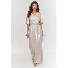 Tento overal je spojením elegance a pohodlí, které jistě přitáhne pozornost na každé speciální události. Volný vrchní díl s rukávy v kimono stylu mu dodávají lehkost a volnost. Tento detail dělá outfit vypadat mimořádně a stylově, zároveň neomezuje pohyb. Výstřih do V je decentní a elegantní, skvěle zdůrazňuje krk a ramena. Takový střih výstřihu přidává smyslnost a zdůrazňuje ženskou siluetu, zachovává klasický, elegantní vzhled. Nohavice s širokým střihem dodávají overalu lehkost a zároveň zakrývají nedokonalosti postavy a umožní prodloužit siluetu. Elastický pas v pasu zajistí přizpůsobení a zdůraznění postavy, vytvoří efekt přesýpacího pásu. Díky tomu se overal nejen stylově prezentuje, ale je i pohodlný po celý den nebo večer. Model je vyroben z jemného materiálu s metalickým povrchem, dodávající outfitu výjimečný lesk a moderní charakter. Overal v metalickém odstínu s výstřihem do V je návrh, který tě vystaví z davu. Jeho moderní střih a lesklý materiál ti pomohou cítit se sebevědomě a stylově na každé oslavě. Je to skvělá alternativa k šatům, zaručující pohodlí a výjimečný vzhled.