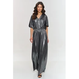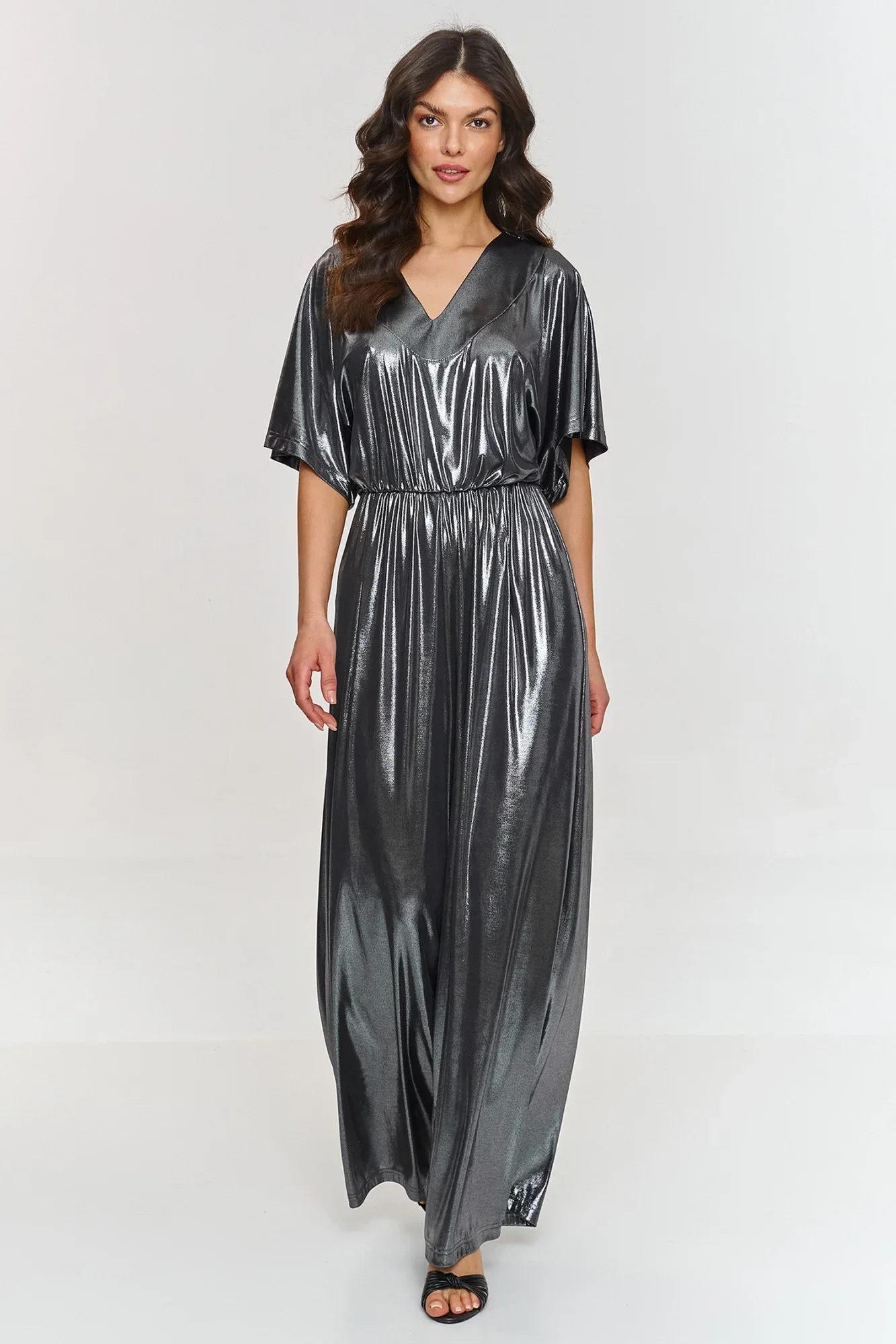 Tento overal je kombinací elegance a pohodlí, která jistě přitáhne pozornost na každé speciální události. Volný vrch s rukávy v kimono stylu mu dodává lehkosti a volnosti. Tento detail dělá outfit vypadat výjimečně a stylově, zároveň neomezujíc pohyb. Výstřih do srdce je decentní a elegantní, skvěle zdůrazňuje krk a ramena. Tento střih výstřihu přidává smyslnost a zdůrazňuje ženskou siluetu, zachovávajíce přitom klasický, elegantní vzhled. Široké nohavice dávají overalu lehkost a zároveň zakrývají nedokonalosti postavy a umožní prodloužit siluetu. Elastický pas v pasu zaručuje přizpůsobení a zdůraznění figury, vytvářejíc efekt vydřeného pasu. Díky tomu se overal nejen stylově, ale i pohodlně prezentuje po celý den nebo večer. Model je vyroben z jemného materiálu s kovovým zpracováním, dodávající outfitu výjimečný lesk a moderní charakter. Overal v kovové barvě s výstřihem do srdce je návrh, který tě vystaví z davu. Jeho moderní střih a lesklý materiál ti zajistí pocit jistoty a stylu na každé party. Jedná se o skvělou alternativu k šatům, zaručující pohodlí a výjimečný vzhled.