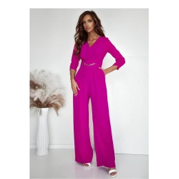 Elegantní a pohodlný kombinéza s elegantním střihem, ideální na různé příležitosti. Vyroben z lehkého, příjemného na dotek materiálu, poskytujícího pohodlí při nošení. Má srdcovitý výstřih, který jemně zdůrazňuje linii krku a dodává ženskost. Na pasu a na rukávech jsou umístěny elastické gumičky, díky nimž se kombinéza skvěle přizpůsobuje postavě. Vložené kapsy po stranách přidávají funkčnost a zakrytý zip zaručuje estetické dokončení. Ozdobný řetízek v pase představuje stylový doplněk, zdůrazňující pas a dodávající celku výjimečný charakter. Ideální volba pro každodenní stylizace, schůzky nebo večerní výlety.