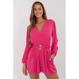 Krátký dámský overal je kombinací elegance a pohodlí, ideální na mnoho příležitostí: od každodenních vycházek, přes obchodní schůzky až po večerní večírky. Vyrobený z příjemné látky (polyester, viskóza, elastan), skvěle padne a poskytuje volnost pohybu. Zavinový výstřih přidává ženský šarm, zatímco dlouhý rukáv zajišťuje, že se model hodí i na chladnější dny. Hladký materiál a zapínací pás v pasu krásně zdůrazňují postavu. Stylová a zároveň praktická volba pro mnoho příležitostí.