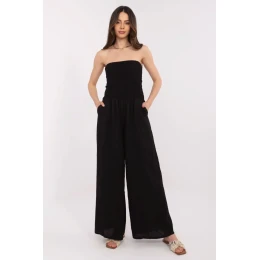 Stylový a pohodlný overal ideální na každodenní nošení. Ušitý z prodyšné a měkké viskózy, zaručuje pohodlí po celý den. Dlouhá, volná forma se širokými nohavicemi a španělským výstřihem vytváří moderní, uvolněný vzhled. Hladký materiál zdůrazňuje minimalistický charakter modelu, a nařasení v horní části mu dodává jemnou lehkost. Absence zapínání usnadňuje rychlé oblékání, a boční, zasouvací kapsy zvyšují funkčnost. Ideální volba pro ženy oceňující styl a pohodlí v jednom.