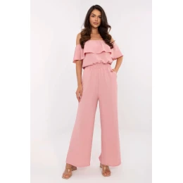 Elegantní a ženský overal s hladkým povrchem je univerzální volbou pro mnoho příležitostí, hodí se jak do každodenního života, do práce, tak i na společenské události. Vyrobený z příjemné směsi viskózy, polyesteru a elastanu poskytuje pohodlí a volnost pohybu. Model bez rukávů s efektním španělským výstřihem ozdobeným volánem decentně zdůrazňuje ramena a dodává celku romantický charakter. V pasu je vsazena elastická guma, která se přizpůsobí postavě a krásně ji zdůrazní. Dlouhé, volně padající nohavice dodávají overalu eleganci, a boční kapsy zvyšují jeho funkčnost. Model nemá zapínání, nasazuje se přes hlavu.