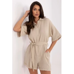 Lehký, mušelínový overal z bavlny je ideální volbou pro každodenní stylizace v teplejších dnech. Hladká struktura materiálu a přirozená prodyšnost bavlny zaručují pohodlí po celý den. Model s krátkým rukávem a klasickým límečkem spojuje volnost a styl. Zapíná se na knoflíky vpředu, co usnadňuje oblékání a dodává elegantní dokončení. Overal je vybaven látkovým páskem k uvázání, který zdůrazňuje pas a dodává ženský tvar postavě. Vsuvné kapsy po stranách zvyšují jeho funkčnost a pohodlí. Je to praktická a stylová volba na léto, skvělá jak na procházku, nákupy, tak i volné setkání s přáteli.