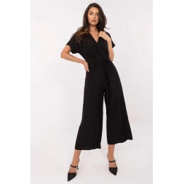 Elegantní a zároveň pohodlný overal s hladkým povrchem je všestrannou nabídkou na každý den, do práce a na více formální příležitosti. Vyrobený z měkké, prodyšné směsi viskózy a nylonu poskytuje pohodlí a lehkost. Model s krátkým rukávem a klopeným výstřihem krásně zdůrazňuje dekolt a zeštíhluje postavu. Dlouhé nohavice dodávají celku eleganci, a materiálový pásek na uvázání v pase umožňuje individuální přizpůsobení a zdůraznění ženské postavy. Je to stylová volba pro ženy, které ocení klasiku v moderním provedení, ideální jak do kanceláře, tak na schůzky nebo večerní vycházky.