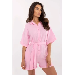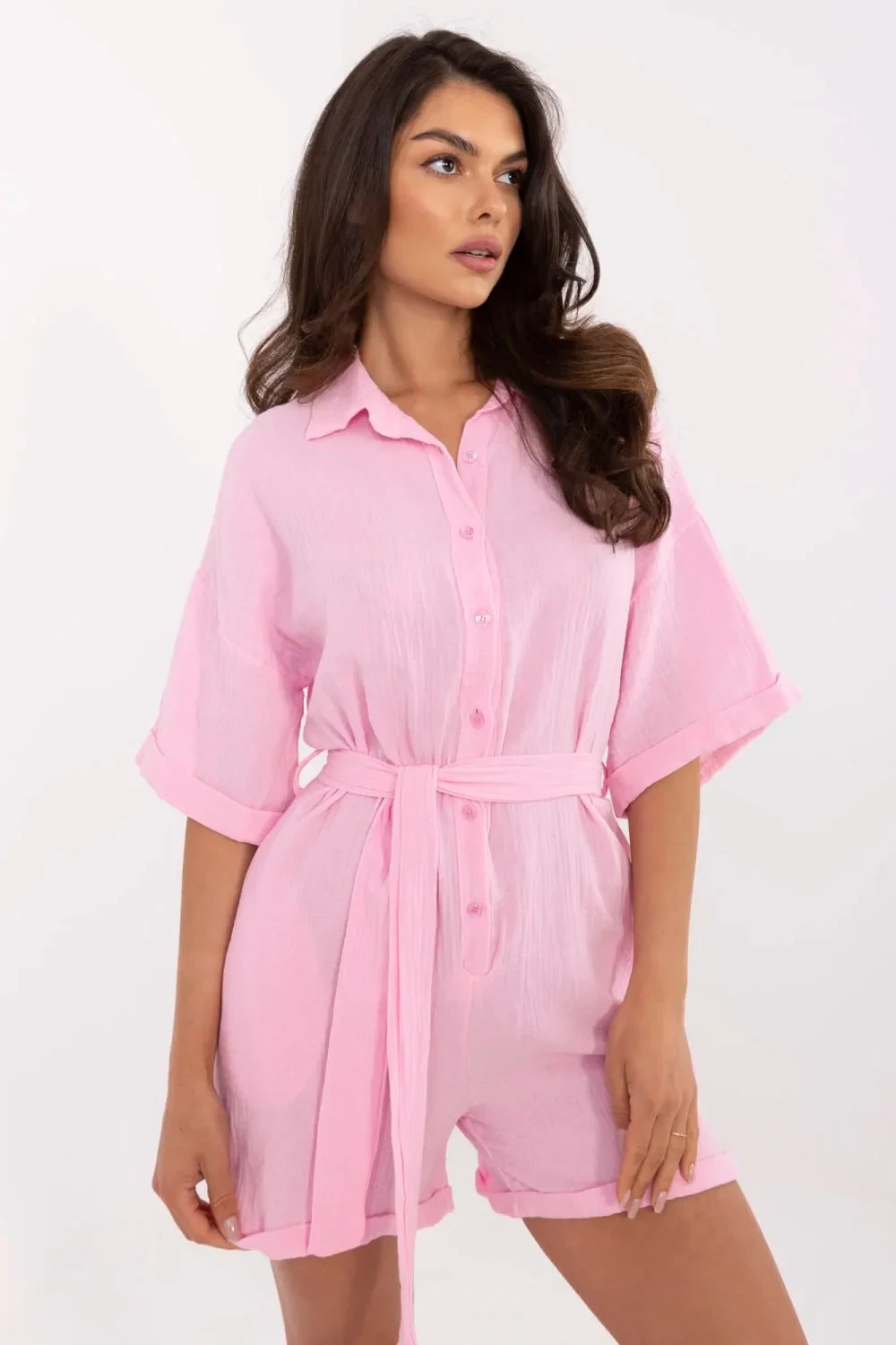Lehký, mušlinový overal z bavlny je ideální volbou pro každodenní outfit v teplejších dnech. Hladká faktura materiálu a přirozená prodyšnost bavlny zaručují pohodlí po celý den. Model s krátkým rukávem a klasickým límečkem spojuje volnost a styl. Zapínání na knoflíky vpředu usnadňuje oblékání a dodává elegantní dojem. Overal je vybaven látkovým páskem k zavázání, který zdůrazňuje pas a dodává ženský tvar postavě. Vložené kapsy po stranách zvyšují jeho funkčnost a pohodlí. Je to praktická a stylová volba na léto, skvělá jak na procházku, nákupy, tak i volné setkání s přáteli.