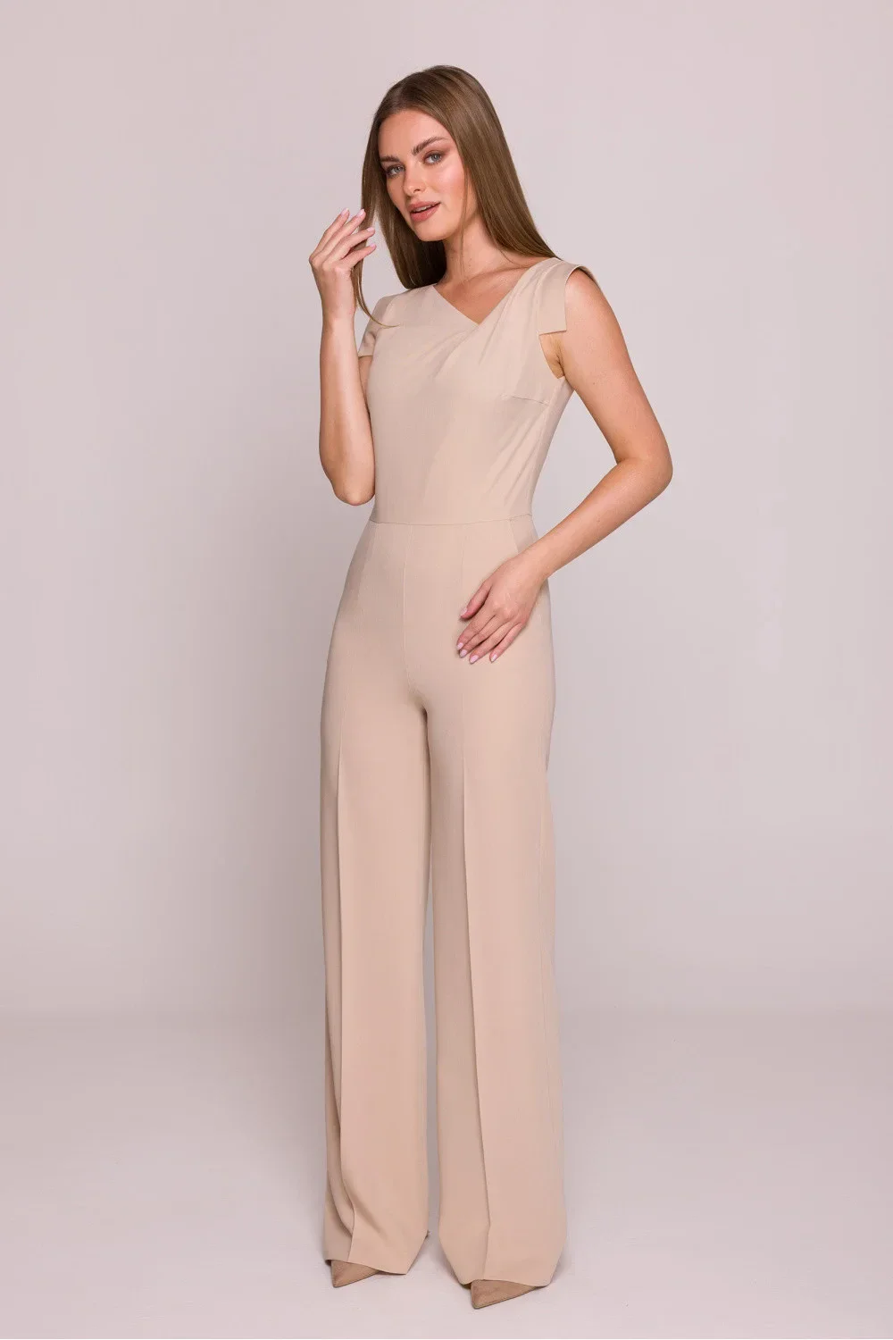 Moderní kombinéza vyrobená z hladké, lehce elastické látky s saténovým zpracováním, které jí dodává jemný lesk a eleganci. Model bez rukávů s asymetrickým výstřihem zdobený efektní přeháňkou, která přitahuje pozornost a zdůrazňuje jedinečný charakter oblečení. Zapínání na skrytý zip na zádech zaručuje pohodlí a udržuje čistý vzhled. Horní část kombinézy je přiléhavá, s vysokým pasem, což zdůrazňuje pas a dodává siluetě ženské tvary. Široké nohavice s přeloženým lemem přidávají styl a zajišťují pohodlí nošení. Boční kapsy jsou praktickým doplňkem a absence podšívky zajišťuje, že je kombinéza lehká a prodyšná. Navrženo a ušito v Polsku.