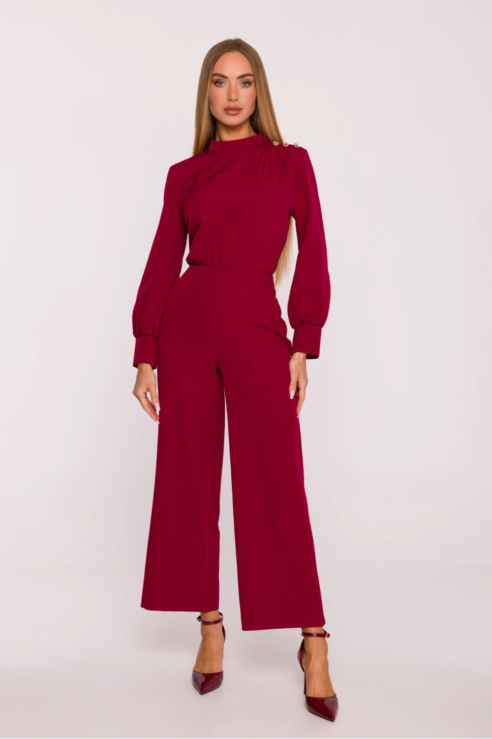 Elegantní kombinéza ušitá z hladké látky s matným povrchem je návrh, který kombinuje moderní charakter s nadčasovou elegancí. Jednodílný střih krásně zdůrazňuje postavu, a přizpůsobený pas a široké nohavice 7/8 dodávají celku lehkost a svobodu. Vrchní část kombinézy se vyznačuje stojánkem s jemným zahuštěním na rameni, které jemně modeluje linii ramen a dodává výjimečný šarm. Dlouhé rukávy jsou zakončeny širokými manžetami s rozkrokem, zdůrazňující elegantní charakter projektu. Ozdobné knoflíky na rameni tvoří stylový detail, který celku dodává nezaměnitelnost. Model se zapíná na skrytý zip vzadu, co zajišťuje pohodlné oblékání a estetické provedení. Chybějící podšívka a kapsy zajišťují, že kombinéza zůstává lehká, a hladká látka umožňuje vytváření mnoha různorodých stylizací, od každodenních po večerní. Navržen a ušit v Polsku, vytvořen s ohledem na ženy, které oceňují eleganci, pohodlí a nadčasový design.