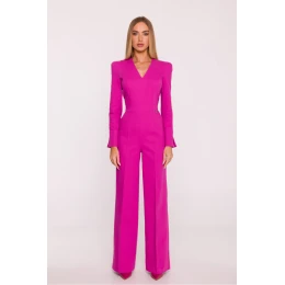 Elegantní kombinéza ušitá z látky imitující denim je jedinečnou nabídkou spojující moderní styl s klasickou formou. Mírně tuhá, matná a jemně elastická látka krásně drží střih, a podšívka zajišťuje pohodlí a bezchybné uspořádání celku. Model se vyznačuje výstřihem ve tvaru písmene V, který jemně zúží krk a dodává postavě lehkost. Dlouhé rukávy zakončené jemným rozšířením u manžety přinášejí elegantní, rafinovaný akcent. Zapínání na skrytý zip na zádech zajišťuje, že celkový dojem je souvislý a uklizený. Horní část kombinézy má jasně vyznačenou, strukturální linii ramen a přizpůsobený pas, který dále zdůrazňuje kovový řetízek s logem. Široké nohavice typu palazzo, sahající až na zem, opticky prodlužují postavu a dávají jí vyvážené, zúžené proporce. Navržený a ušitý v Polsku, vytvořený s ohledem na ženy, které oceňují moderní eleganci, pohodlí a dokonalé provedení v každém detailu.