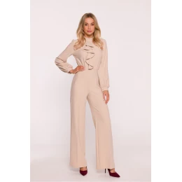 Elegantní, klasický overal vyrobený z hladké látky s jemným povrchem. Horní část je přiléhavá, zdobená jemným žabotem a ukončená stojáčkem kolem krku. Dlouhé, lehce objemné rukávy jsou zakončeny manžetami se zapínáním na ozdobné knoflíčky, co celkově přidává rafinovaný charakter. Pas je zřetelně zdůrazněn, což podtrhuje siluetu a harmonicky přechází do volnějších, přímých nohavic s opleteným lemem. Na zádech skrytý zip zajišťuje pohodlí nošení a estetické dokončení. Model spojuje nadčasovou klasiku s moderním detailen, ideální jak na elegantní výstupy, tak i formální příležitosti. Navrženo a ušito v Polsku.