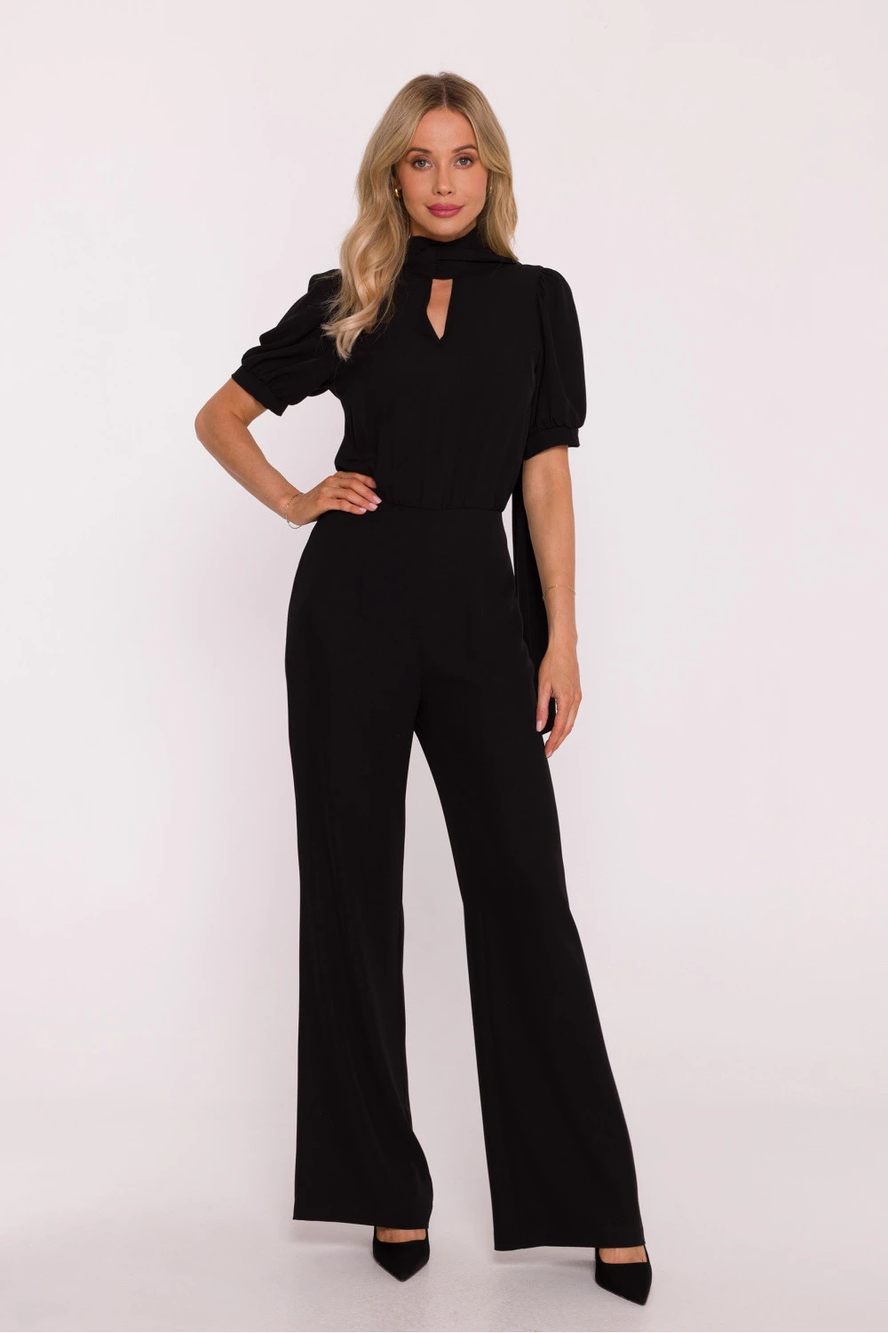 Elegantní dámský kombinéza je stylovou alternativou k šatům, ideální volbou na speciální události a elegantní výstupy. Vyrobený z hladké látky s lehkým leskem, působí velmi elegantně a zároveň zaručuje pohodlí nošení. Model se vyznačuje ženským výstřihem ve tvaru písmene V, spojeným se stojkou přecházející do efektního vázání, které celku dodává jemnou jemnost. Krátké, nafouklé rukávy jsou zakončeny manžetou s jemným mašlováním, díky čemuž silueta získá lehkost a romantický charakter. Horní část má lehce zbluzovaný střih a pas s vysokým sedem krásně zdůrazňuje postavu a opticky prodlužuje nohy. Nohavice jsou dlouhé, široké a lehce rozšířené ke spodu, což dodává siluetě elegantní proporce a zajišťuje volnost pohybu. Celkový vzhled doplňuje skrytý zip vzadu, zaručující ideální přizpůsobení. Navrženo a ušito v Polsku s důrazem na detaily a nejvyšší kvalitu zpracování.