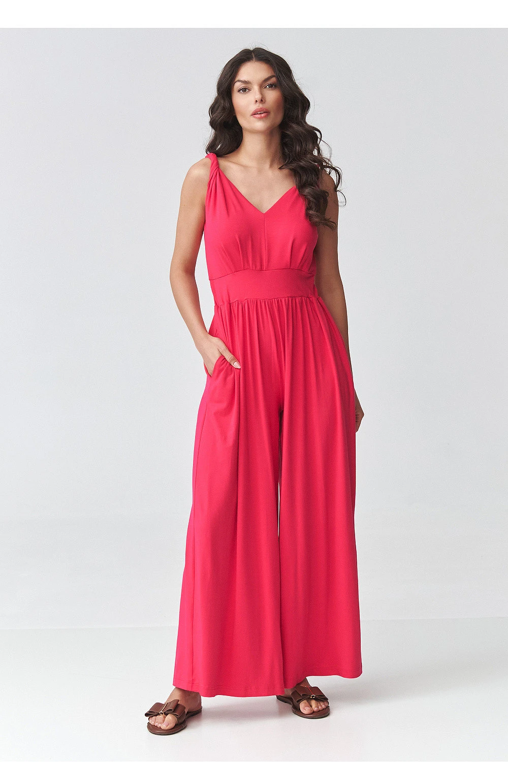 Stylový dámský overal na ramínka je ideální volbou pro ženy, které hledají spojení elegance a pohodlí. Lehký, padavý materiál krásně padne na postavě, a zdůrazněný pas dodává figurce proporcionální vzhled a ženský charakter. Jemné dekolt do V opticky zúží horní část postavy a dodá celku lehkost. Model má široké nohavice, které zajišťují volnost pohybu a zapadají do aktuálních trendů. Dlouhý dámský overal se skvěle hodí jak na každodenní nošení, tak i na speciální příležitosti. Je skvělou alternativou k šatům - ideální jako overal na svatbu, večírek, dovolenou nebo rande. Univerzální střih umožňuje různé stylové kombinace, v kombinaci se sandály vytváří lehký letní vzhled, a se špičatými podpatky získává elegantnější charakter. Pokud hledáte nadčasový model, tento stylový overal s širokými nohavicemi bude skvělou volbou.
